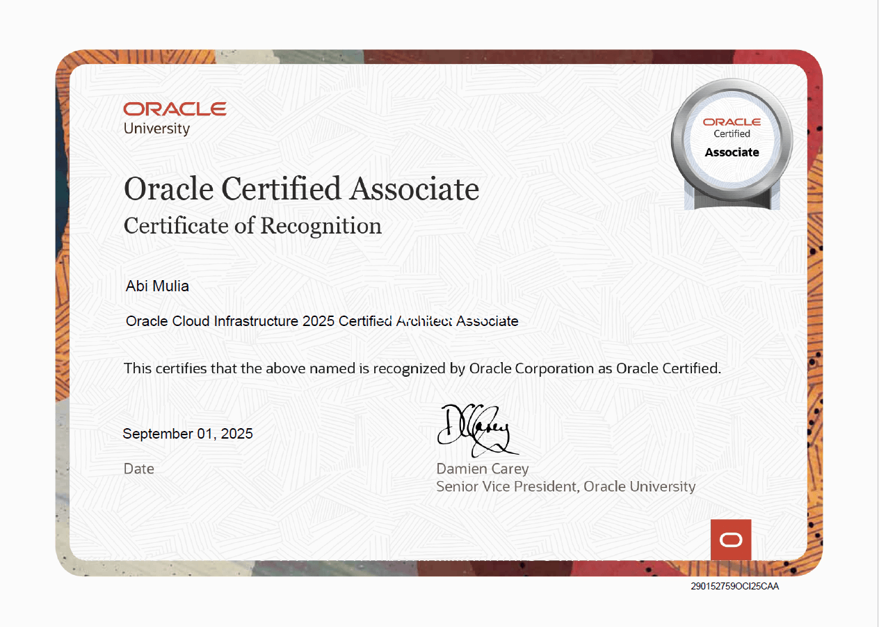I have foundational experience in cloud platforms including AWS, Microsoft Azure, and Oracle Cloud Infrastructure, supporting deployment and system integration needs. I understand core security principles such as access control, network configuration, VPN, and secure data handling. I focus on maintaining system reliability, protecting data integrity, and following best practices in cloud and infrastructure environments.