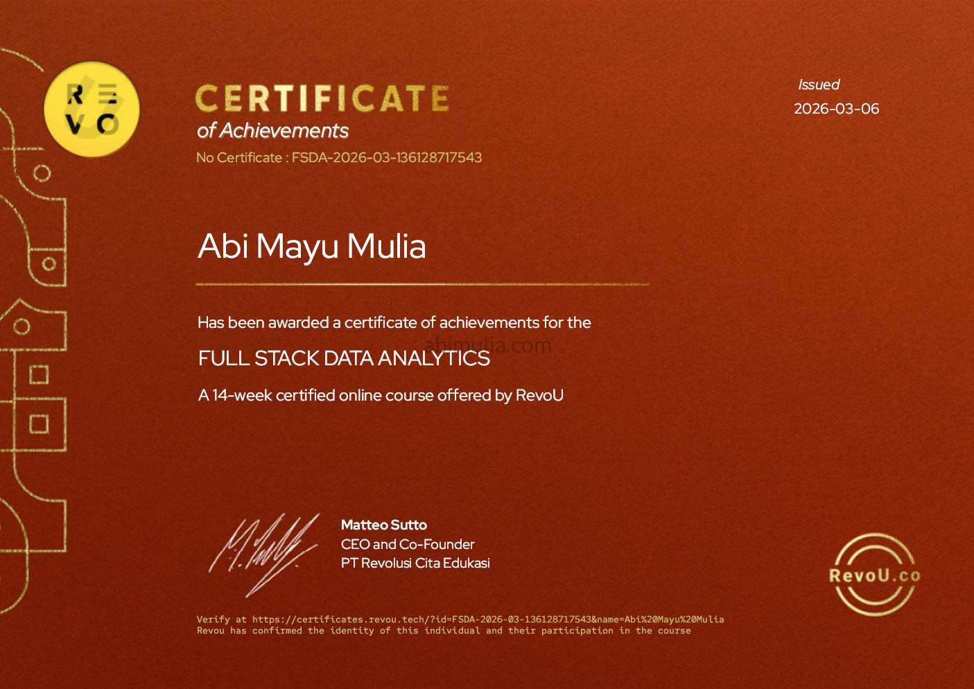 I completed the Full Stack Data Analytics (FSDA) program at RevoU, where I gained hands-on experience in data cleaning, analysis, segmentation, and visualization. Through practical projects, I developed the ability to turn raw data into clear insights and actionable business recommendations.