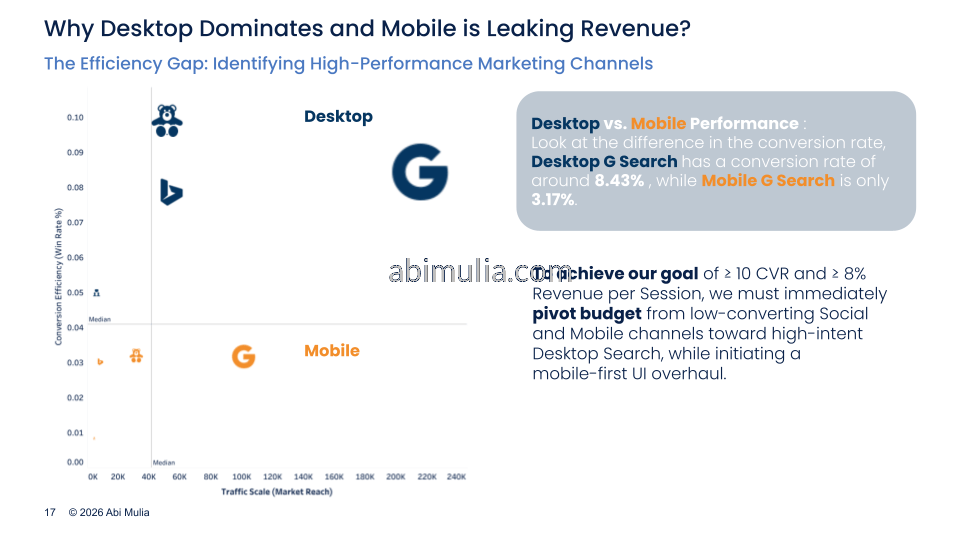 Analysis revealed a 44.76% bounce rate at landing and a critical 54.82% drop-off at the product-to-cart stage. Recommendations include reallocating 20% of the budget to Direct and Social Book channels to reduce G-Search dependency and launching automated recovery emails to capture lost revenue. A mobile-first UI overhaul is required as desktop conversion significantly outperformed mobile.