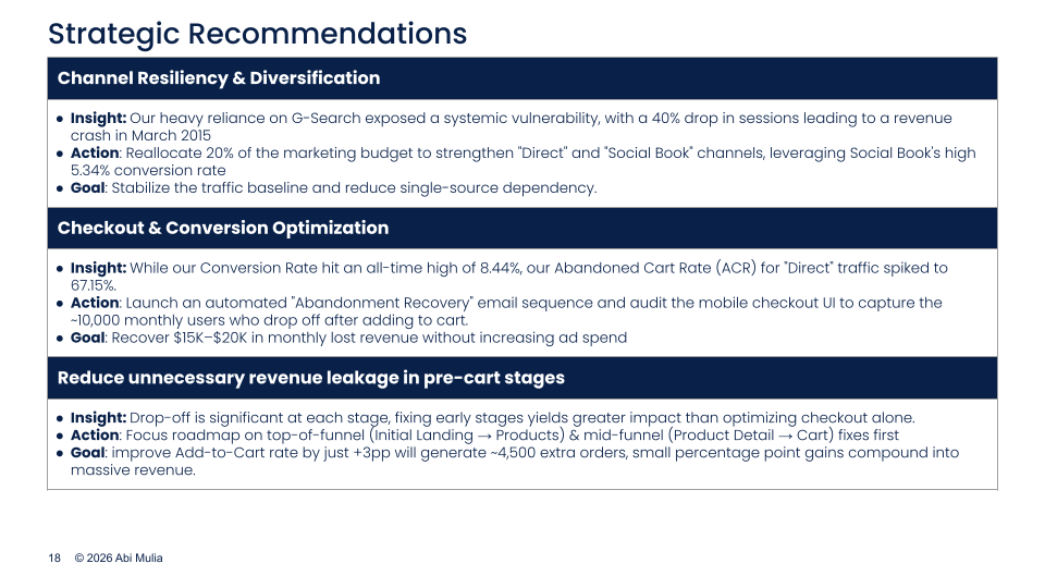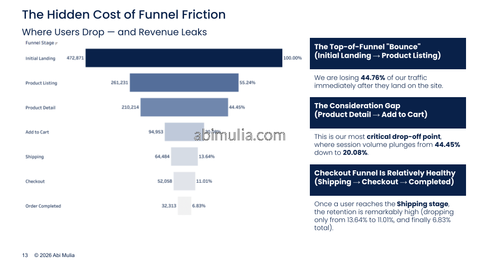 - Identified critical friction points where 44.76% of traffic bounced at landing and 54.82% dropped off before adding products.