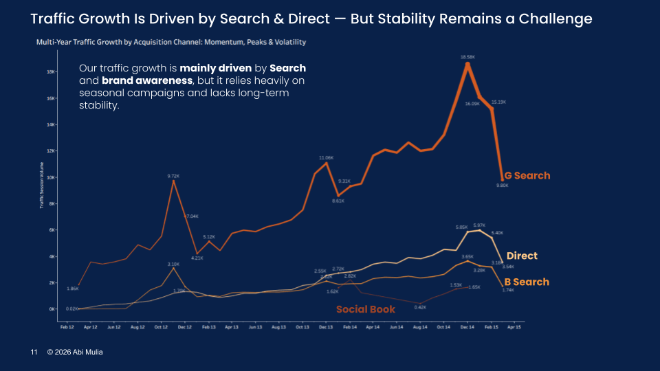 - Recommended reallocating 20% of marketing spend to high-converting channels like Social Book to stabilize the volatile traffic baseline.